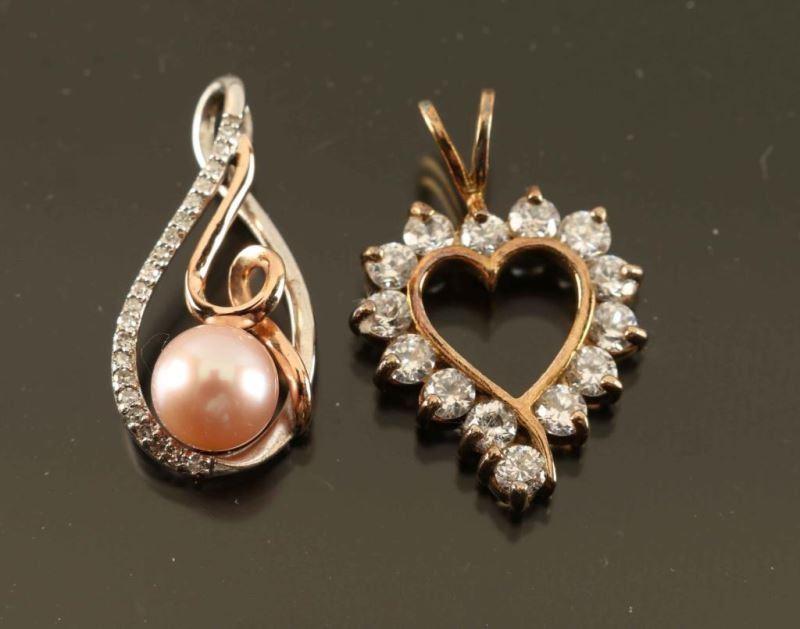 (1) Teardrop Pendant With Rose Gold, Silver And Channel Set Diamonds With A Pearl Cradled On The Bottom Of The Drop. (1) Gold Plated Silver Heart With Cubic Zirconias.