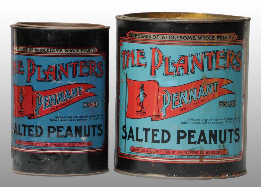 Description Includes one five-pound pennant tin with lid and one ten-pound pennant tin with lid. Condition (Good). Size Largest: 9 - 3/4".