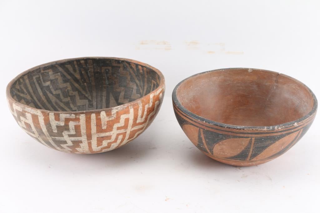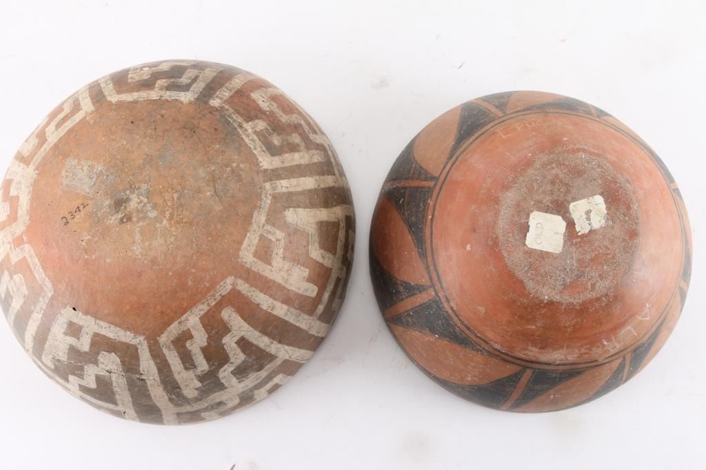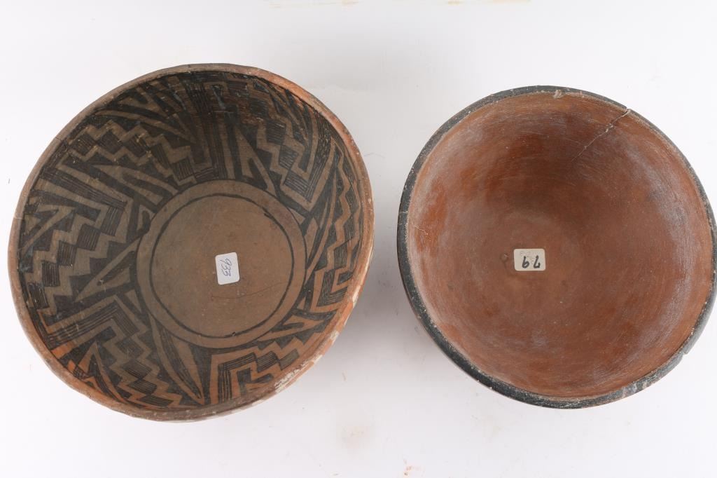 (1) Smaller prehistoric pot is black on red, also has been repaired. Measures 8 x 3".