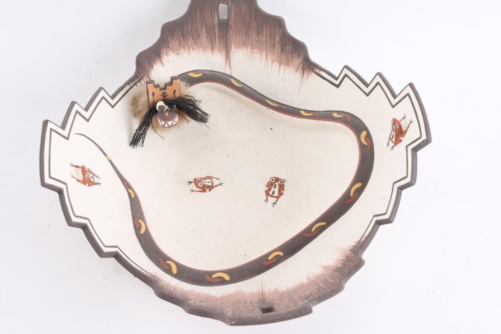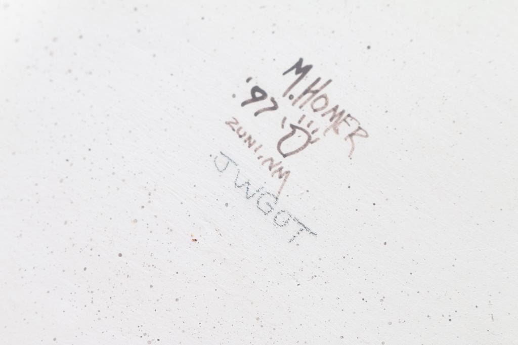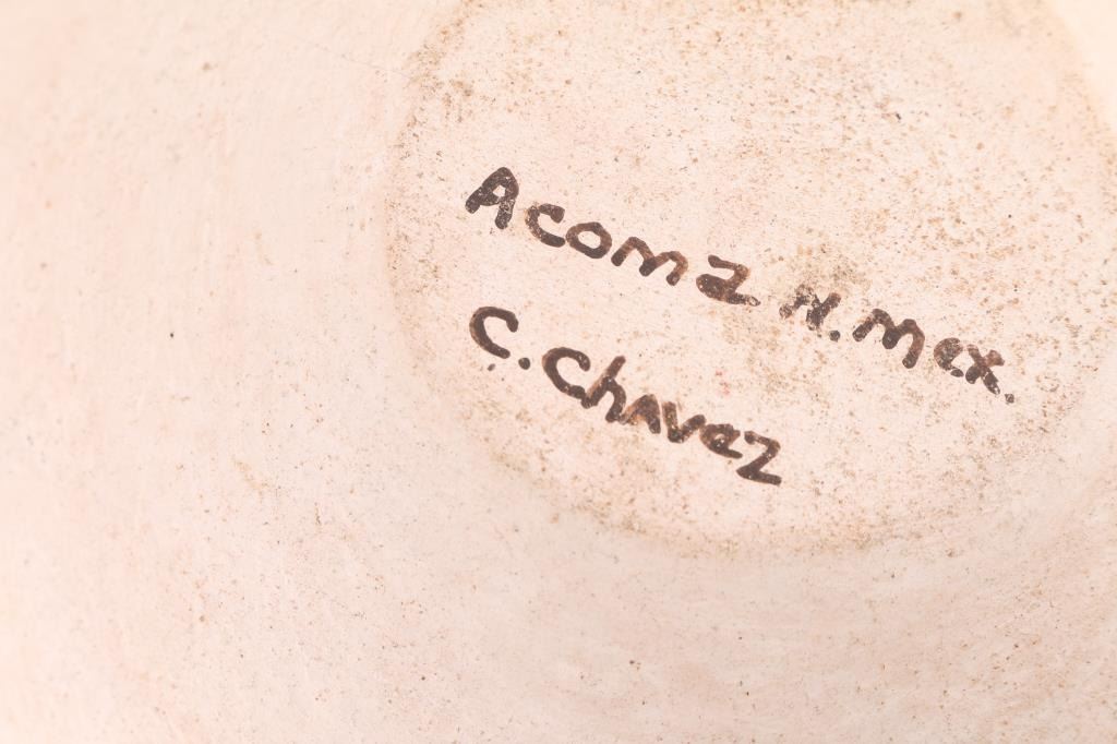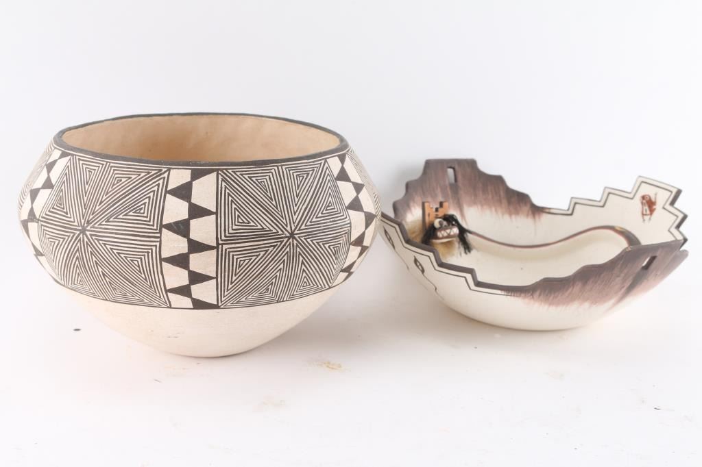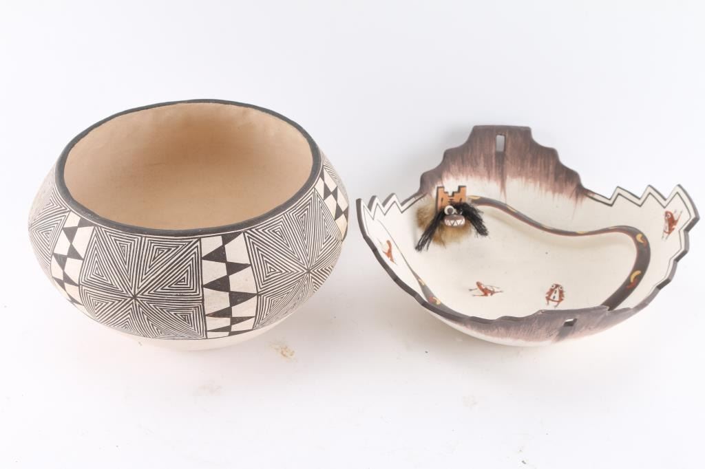 (1) Polychrome Acoma Pot measuring 8x6; and (1) Zuni snake and frog pot signed M. Homer.