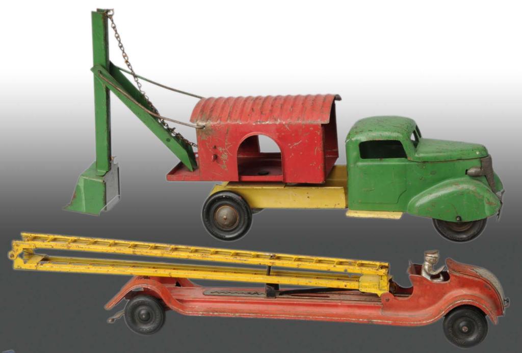 Description Includes one original Turner Steam Shovel Truck and one Keystone Fire Extension Ladder Truck. Both toys show overall play wear. Condition (Good). Size Largest: 22" L.