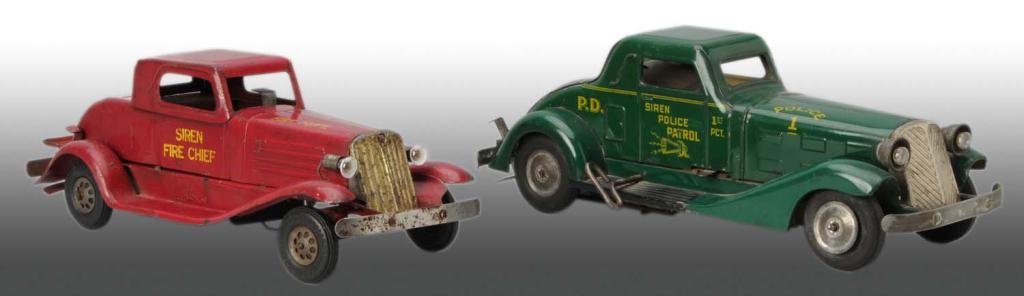 Description Includes one Marx Siren Police Patrol car missing rear taillight and one Marx Fire Chief Siren car. Both cars have electric headlights and show overall play wear. Condition (Very Good). Size Largest: 16" L.