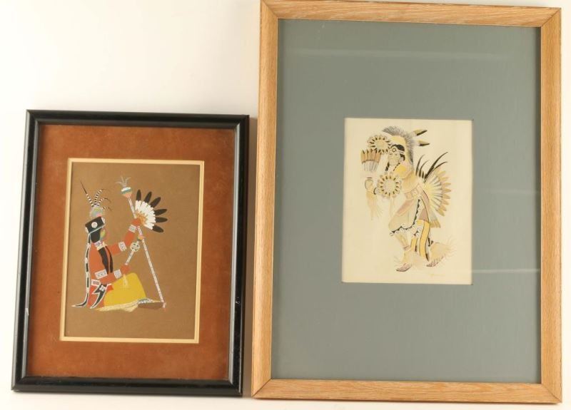 By Mopope one of Kachina dancer that measures 9"x7" and second of ceremonial dancer measures 9 1/2"x7". Both in mats and wood frames.