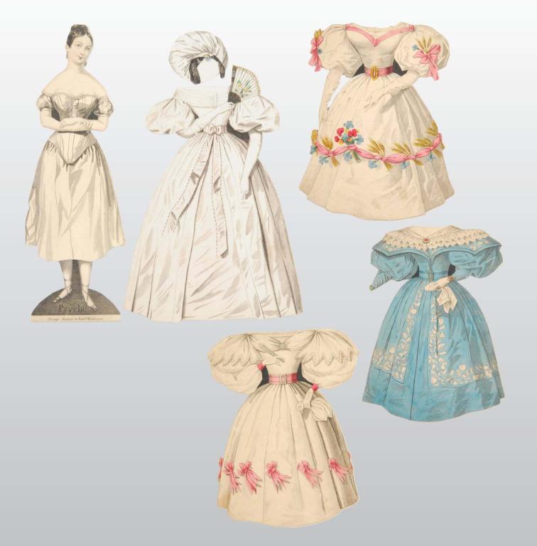 Description Circa 1830s. This is a beautiful 7-inch light cardboard front/back "Psyche" with three front/back gowns in excellent condition. Also include: an 8-inch light cardboard "Psyche" with six front/back gowns and one bonnet. The doll is soiled and has a neck bend. Overall very good condition.