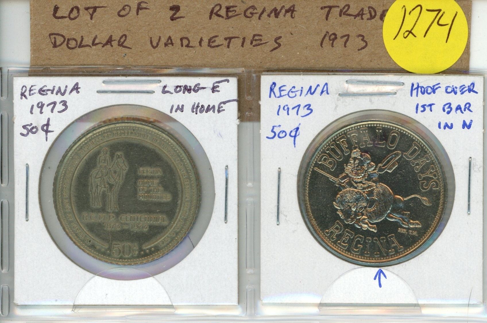 Lot of 2 Regina 1973 Trade Dollars. Actually, they’re both 50 Cents. Includes Long E in HOME and Hoof over First Bar in N. Uncirculated.