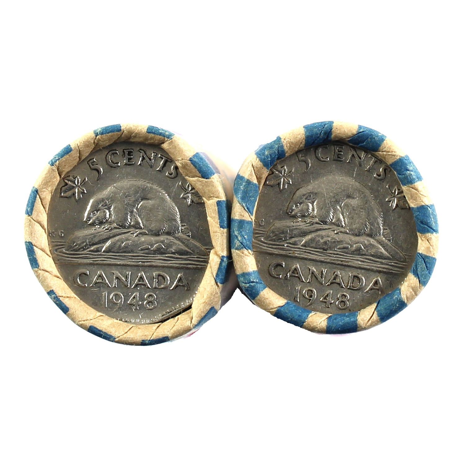 Lot of 2 Rolls of 1948 Canadian 5-cent Circulated condition. 2 rolls