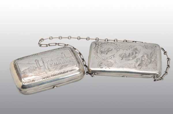 Description Weighs 9.4 troy ounces. Includes one box made in Moscow, circa 1874, with a cushion-shaped lid engraved and nielloed with a harbor scene. Also includes one box with floral engravings and mounted with a chain. Condition (Good). Size Largest: 4 - 1/4" L.