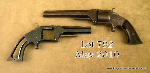 Lot of 2 S&W #2 Army Model Revolvers. S&W #2 serial #34843, traces of original blue, good markings, good overall, action not quite working. Along with S&W #2 Army, serial #45210 cut bbl, no cylinder, no grips, 50-60% blue, internal partspresent. Est. $400 800
