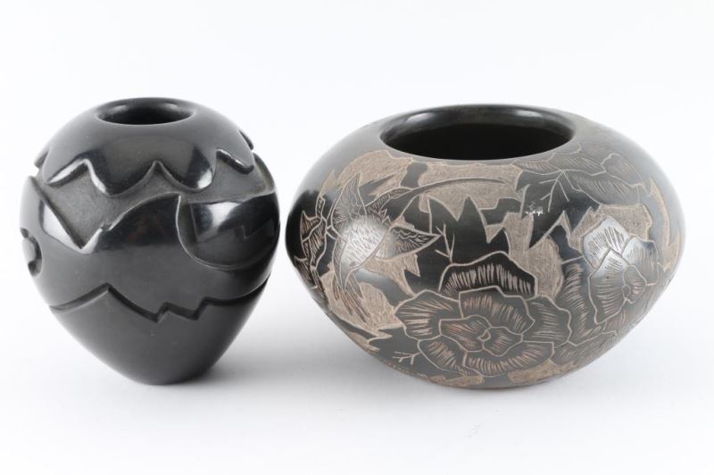 Larger pot has a floral and hummingbird motif and is signed on base Gwen Tofoya, 6x4". 2nd is a Santa Clara pot signed Vickie Martinez.