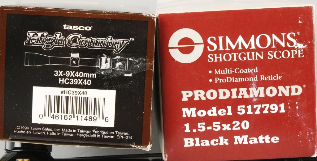 Including: Tasco High Country 3X-9X40MM and Simmons Master Series shotgun scope Prodiamond 1.5-5X20.