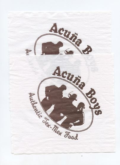 This is a lot of 2 prop "Acuña Boys Authentic Tex-Mex Food" napkins screen used in the Quentin Tarantino film "Jackie Brown." These items are accompanied by a letter of authenticity from Star Wares.