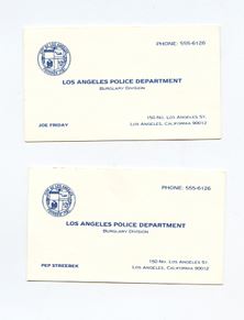 This is a lot of 1 Joe Friday prop business card and 1 Pep Streebek prop business card screen used in the Dan Aykroyd and Tom Hanks film "Dragnet." This lot comes with a letter of authenticity from Star Wares.