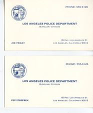 This is a lot of 1 Joe Friday prop business card and 1 Pep Streebek prop business card screen used in the Dan Aykroyd and Tom Hanks film "Dragnet." This lot comes with a letter of authenticity from Star Wares.
