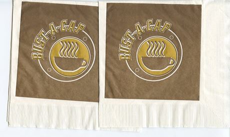 This is a lot of 2 prop "Bust-A-Cap" napkins screen used in the Quentin Tarantino film "Jackie Brown." These items are accompanied by a letter of authenticity from Star Wares.