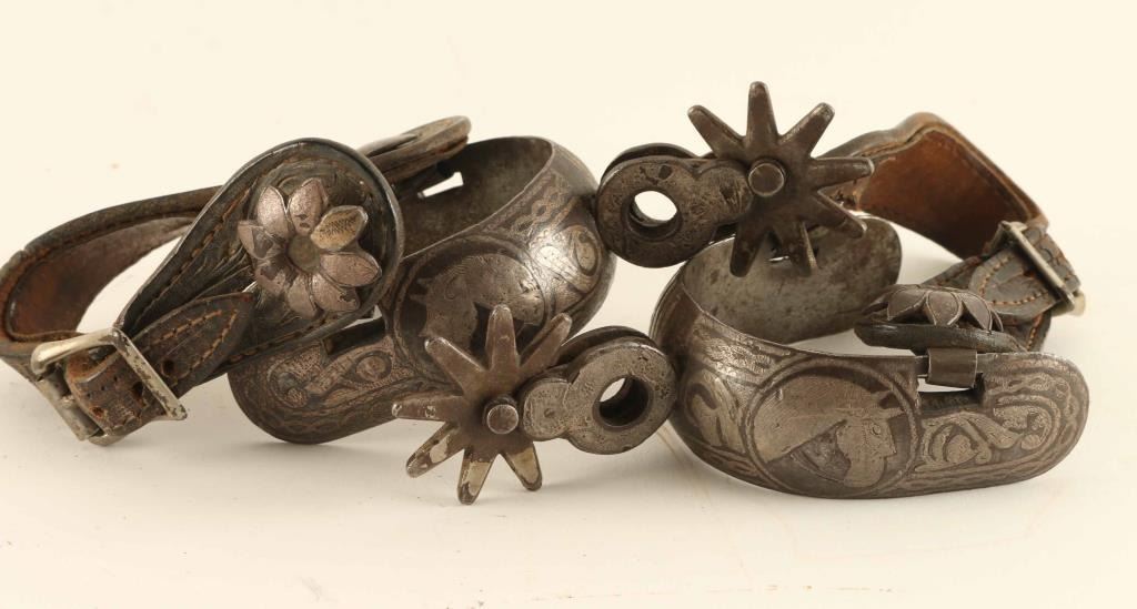 Lot includes (1) Old Mexican Chillahua style spur set with nearly all of the silver work in tact, depicting horse head and flowers, and (1) set of Contemporary Spurs from little known maker Rhea, personalized with silver overlay and have a 10 point rowel.