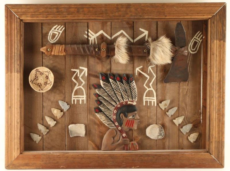 One cowboy theme with wooden background horseshoe, belt strap, mini straw hat and cowboy boot with rope and brass tack accents in wood frame. Measures 21 1/4"x17 1/4". The other has a Native American theme with slatted wood background with tomahawk, basket, pottery shards, arrowheads, carved wooden chief and painted native symbols in wood frame. Measures 25 1/4"x33 1/4".