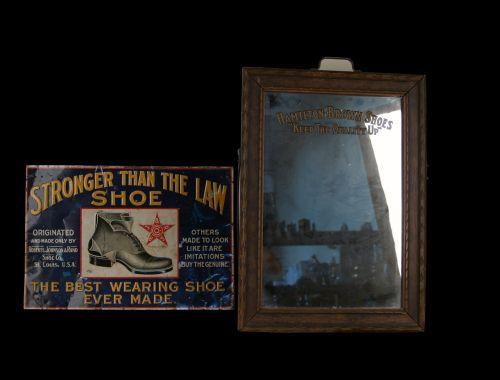 Lot of 2 Shoe Items: Tin Sign & a Store Mirror R.J & R. S. Shoe Co. on tin sign