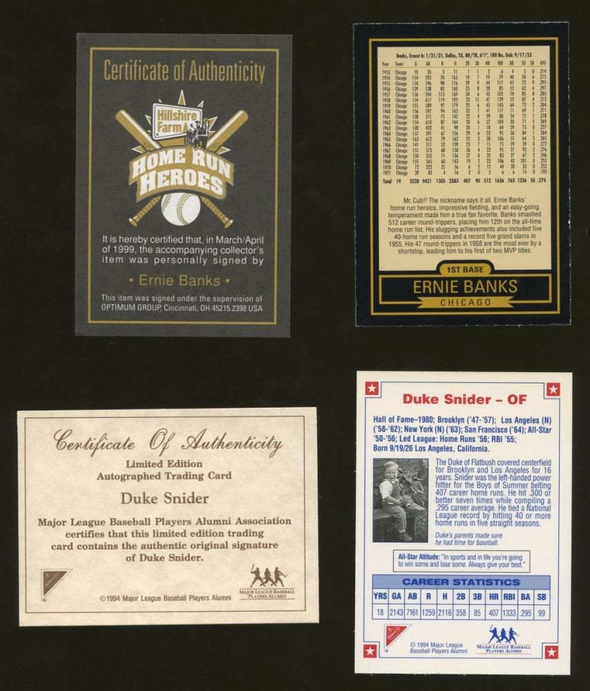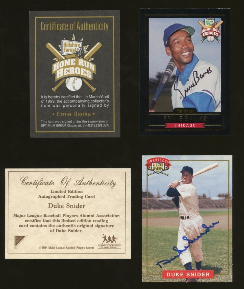 Cards have been hand-signed in felt-tip pen by Ernie Banks (Cubs HOF) and Duke Snider (Dodgers HOF). Snider card includes a COA from Major League Baseball Players Alumni Association. Banks card includes a COA from Optimum Group who witnessed the signing.