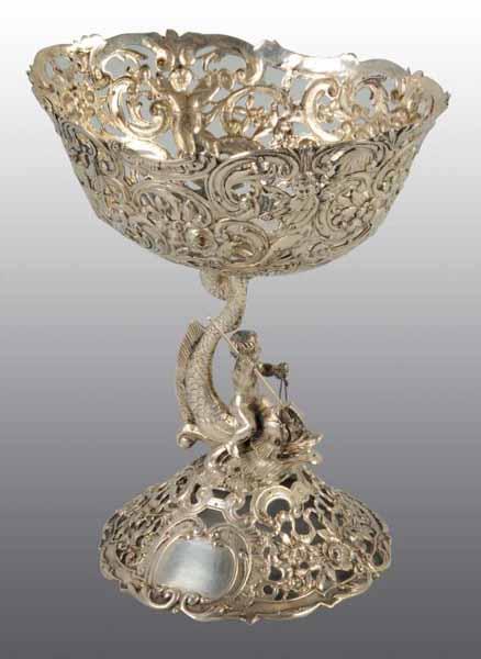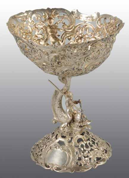 Description Weighs 14.8 troy ounces. German. Marked "Germany 800". Depicts a Neptune child riding a dolphin with open lattice work at top. Condition (Excellent). Size Both: 6 - 1/4" T.