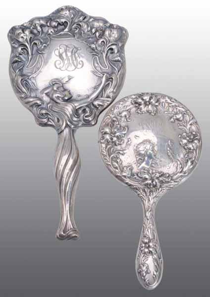 Description Includes one mirror with a ribbed handle in the form of an Art Nouveau style female figure holding scrolls of foliage forming the shaped edges. Also includes one mirror with a circular back and chased with scrolls around a female bust. Condition (Very Good). Size Largest: 12 - 1/4" L.