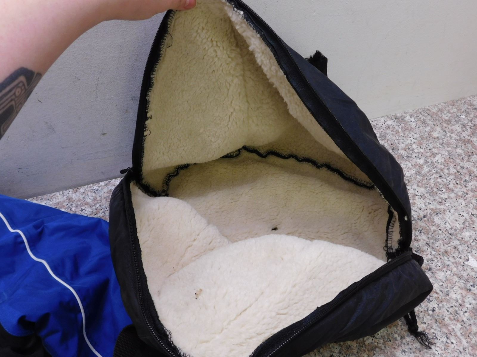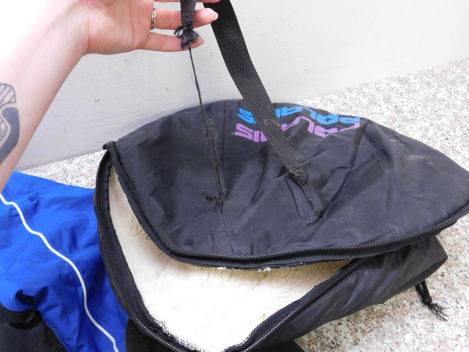one strap on helmet bag is torn