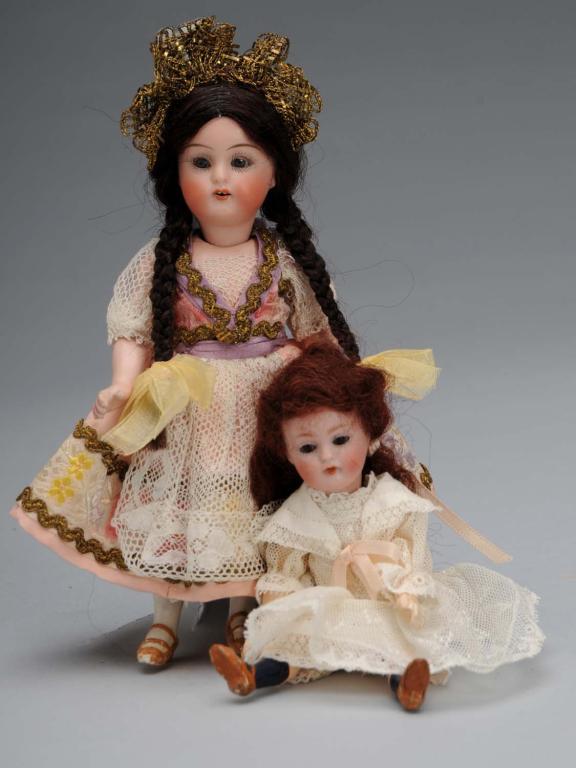 German, circa 1900. Smaller incised 133, made by J.D. Kestner with dark sleep eyes, open mouth, and replaced mohair wig. Has jointed five-piece composition body with molded and painted shoes and socks and head is glued into socket. Wearing vintage cotton and lace dress , undergarments and hat. Larger is incised K [star] R by Kammer & Reinhardt. Blue sleep eyes, open mouth and original mohair braids. Has jointed five-piece composition body with molded and painted socks. Wearing all original outfit including undergarments. Condition (Excellent). Size Largest: 6" T.