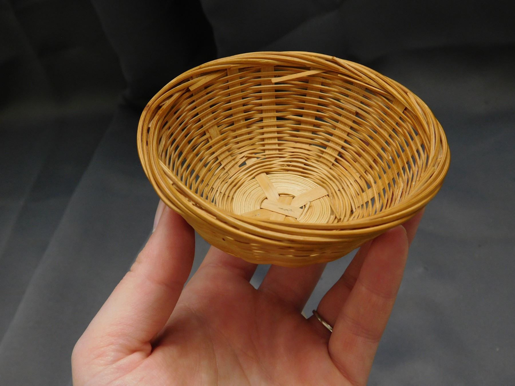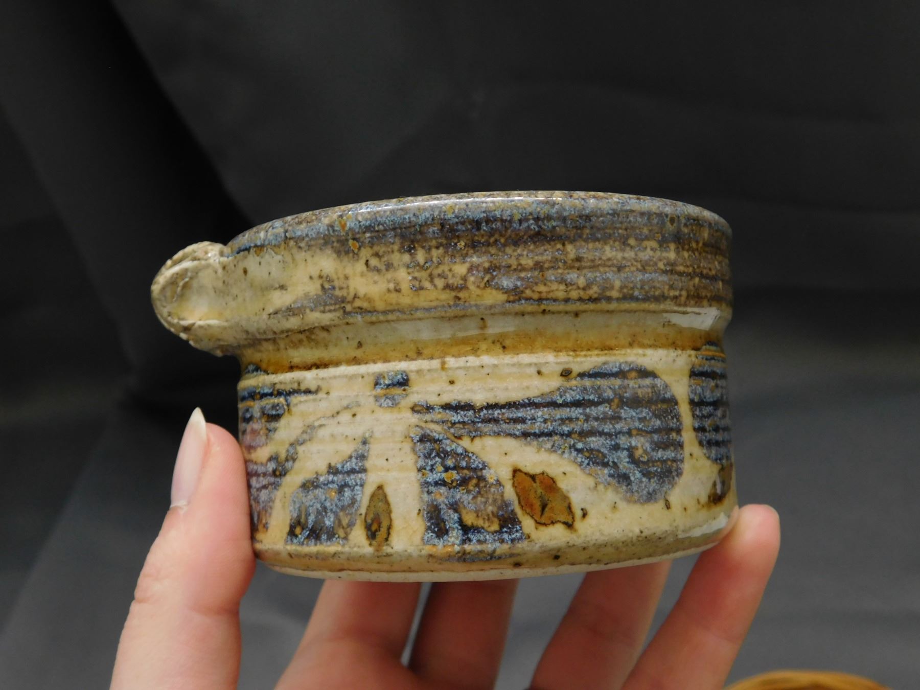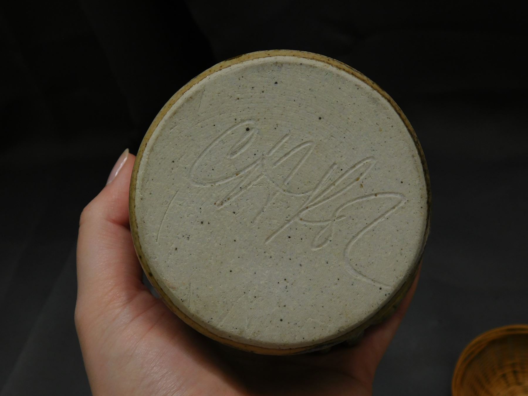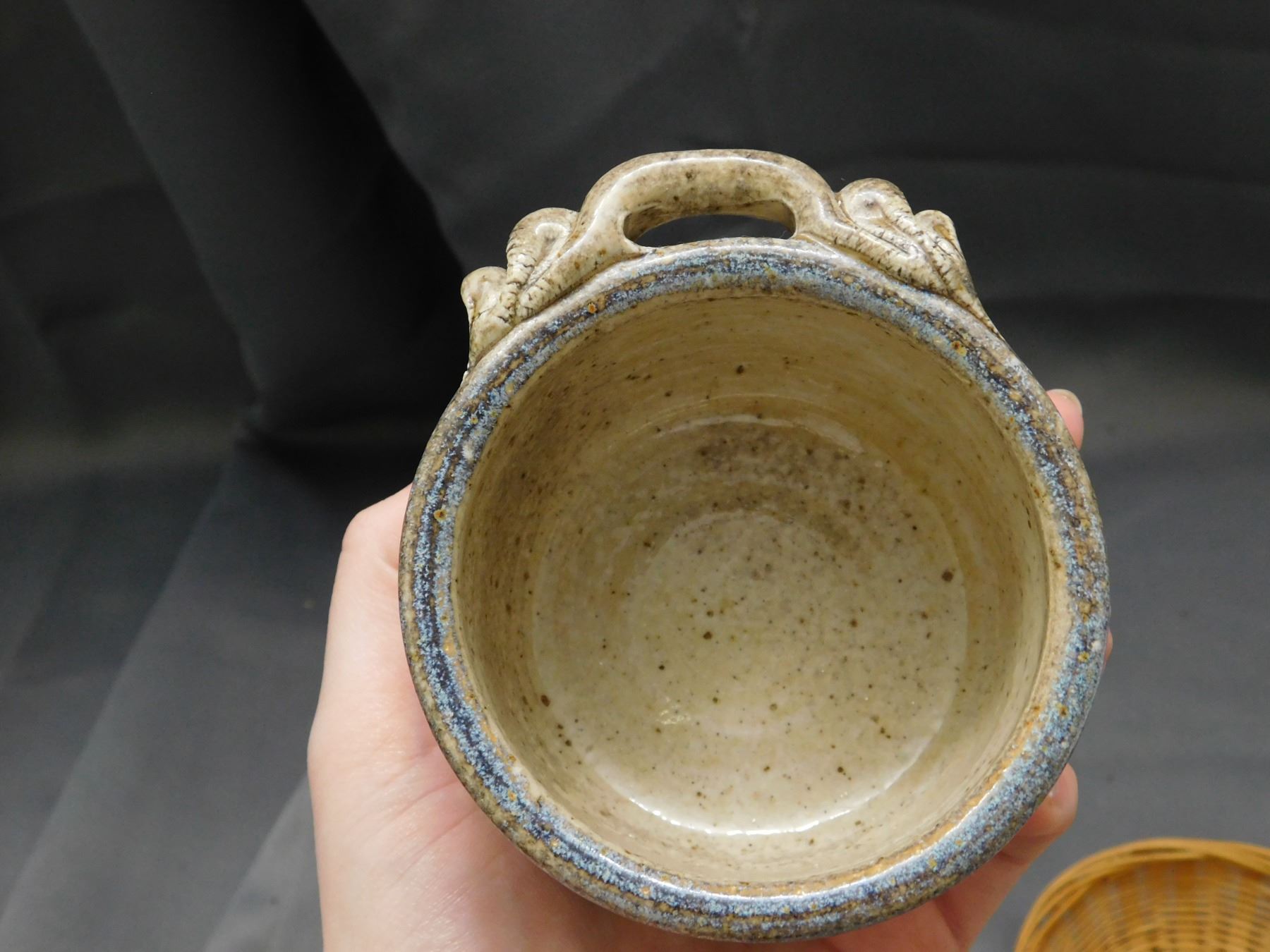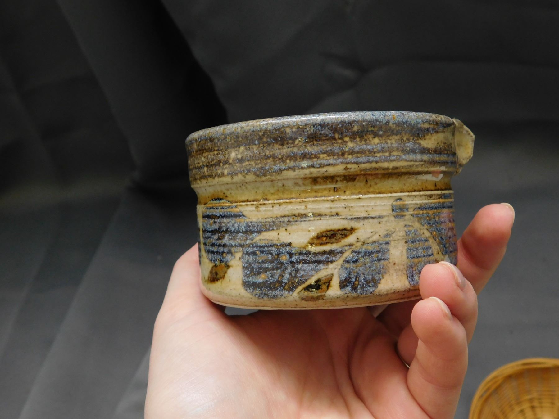 Lot of 2 Small Pottery Dish Artist Signed Stoneware & Wicker Basket