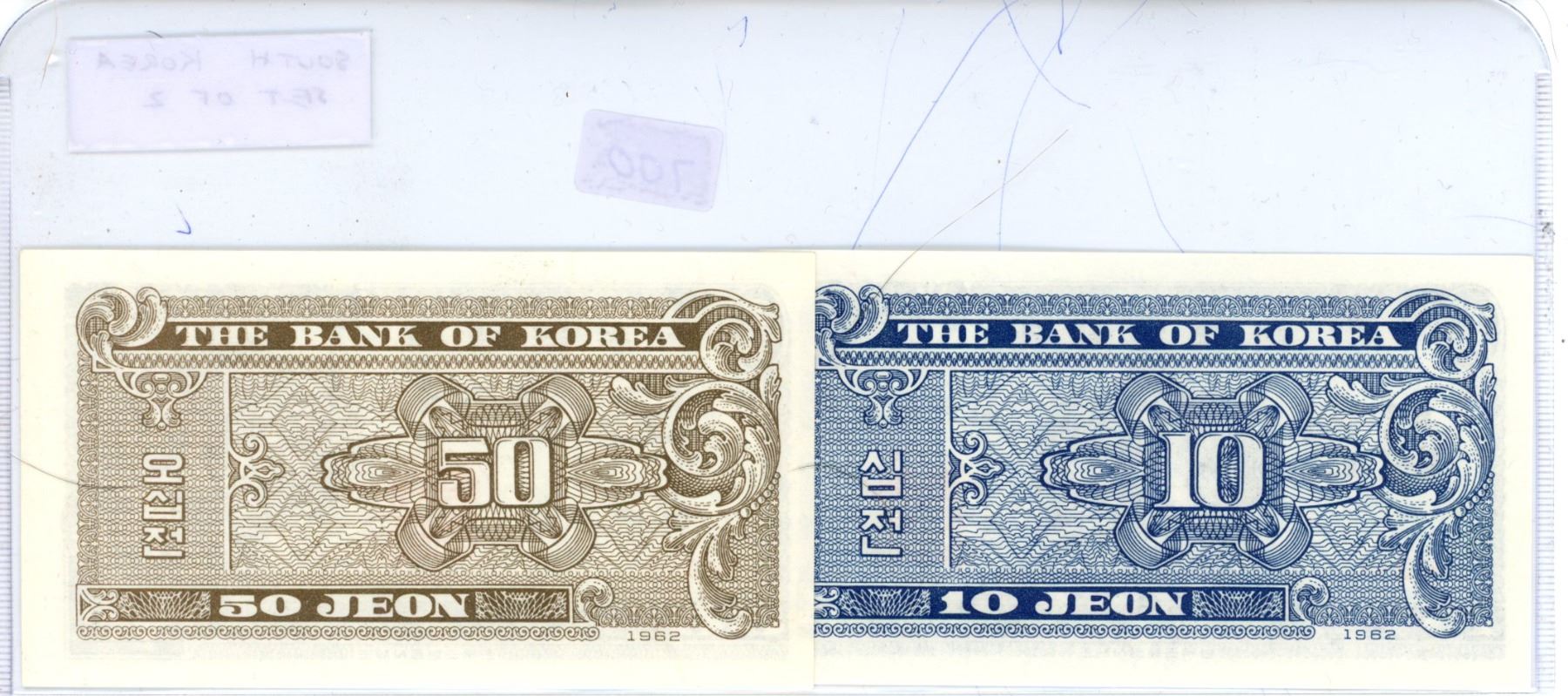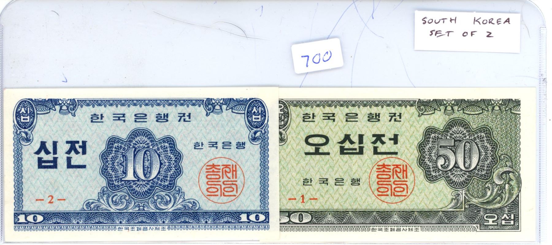 Lot of 2 South Korean notes. 10 Jeon & 50 Jeon. Uncirculated.