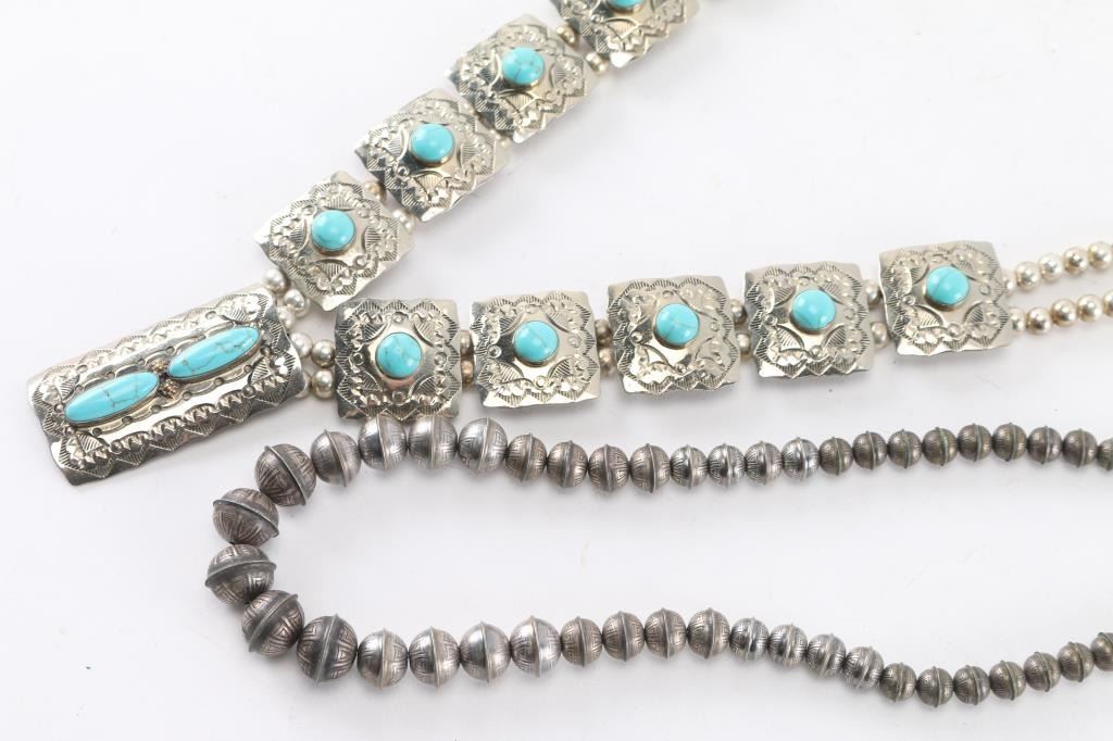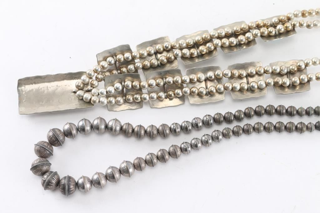 (1) Stamped silver beads with thunderbird at clasp, 26" end to end;