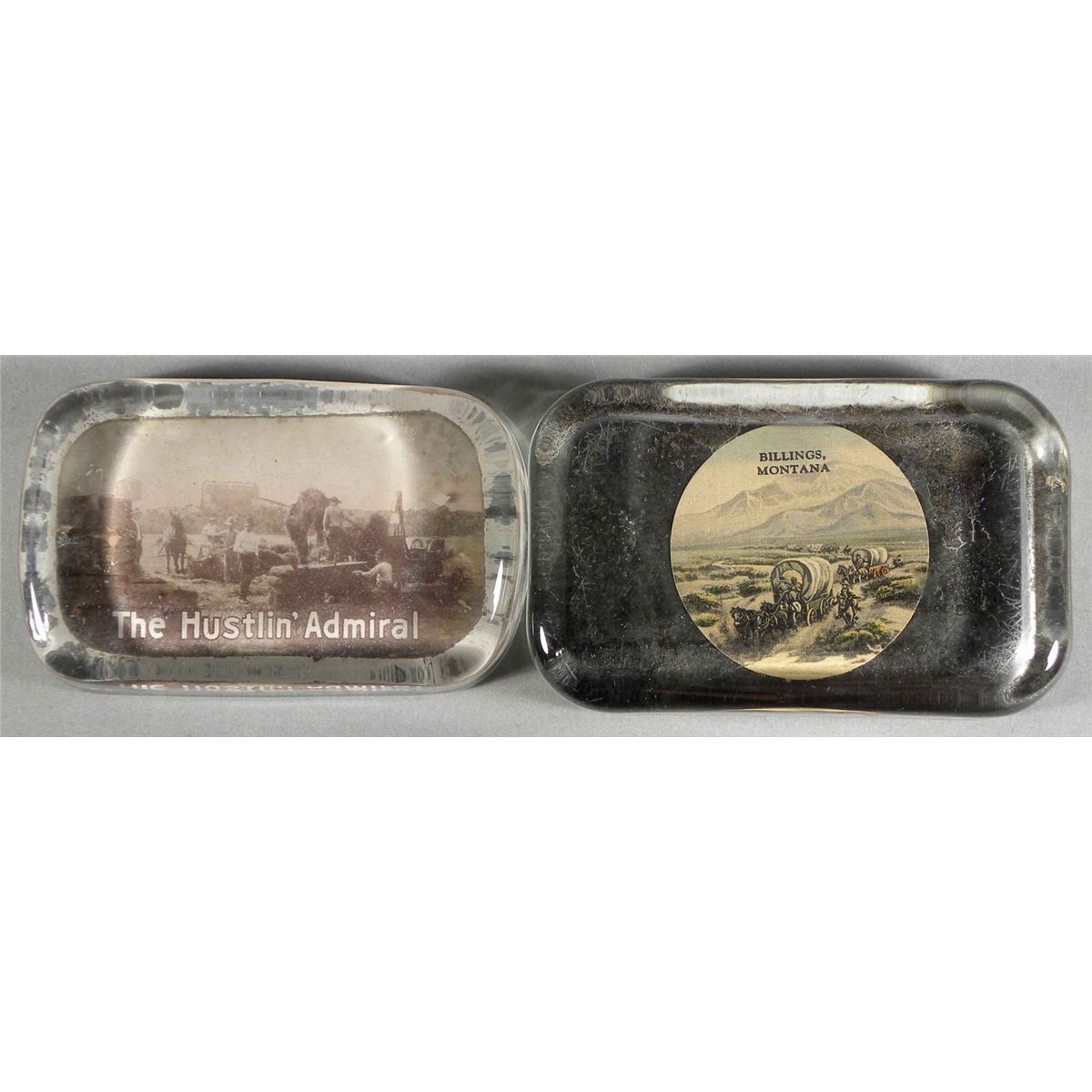 Lot of 2 Souvenir Glass Paper Weights. Billings, MT depicting Wagon Train. Men working on docks, "The Hustlin'Admiral". Both in good condition. Lg one measures 4 1/2 X 2 1/2 inches. Start Price $30