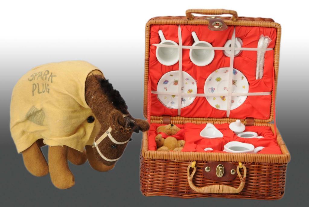 Description Teddy Bear Tea set is contemporary from 2004 and made in China. Sparkplug doll is circa 1920s. Condition (Excellent - Near Mint). Size Largest: 12" L.