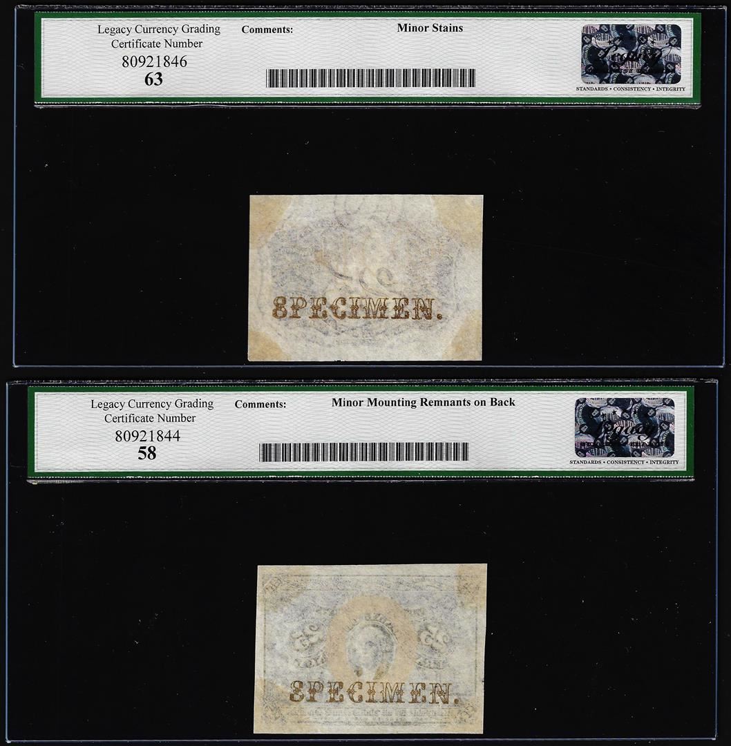 One Lot of (2) Specimen 2nd Issue 25 Cent Fractional Notes Fr.1283sp AU58 & Choice New 63. Legacy Graded.