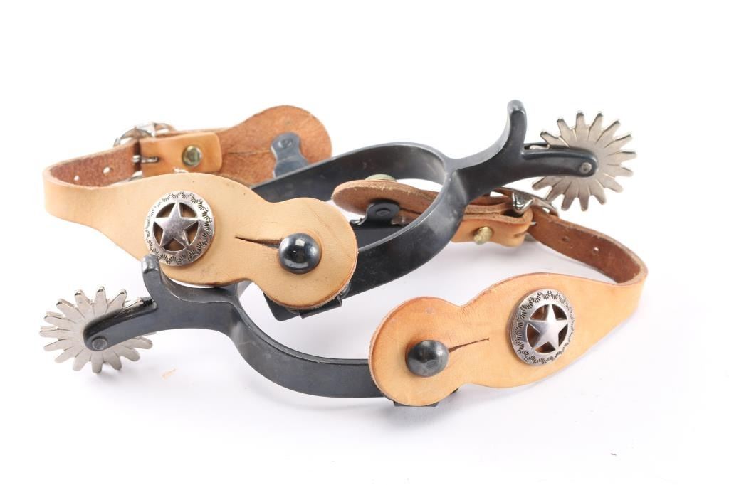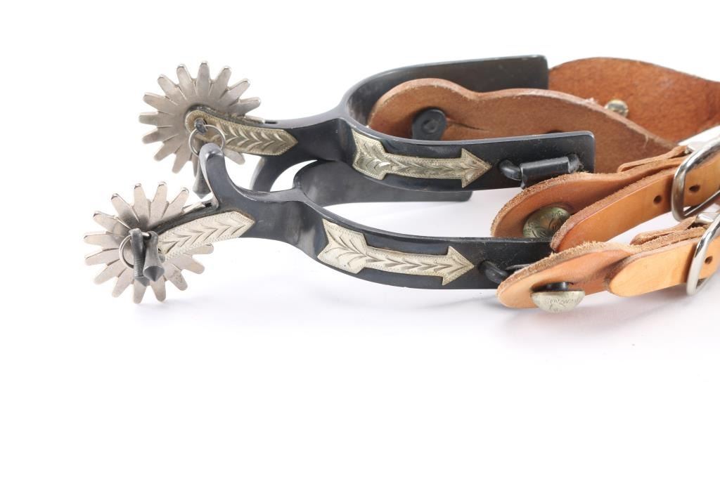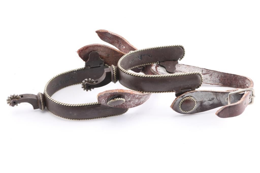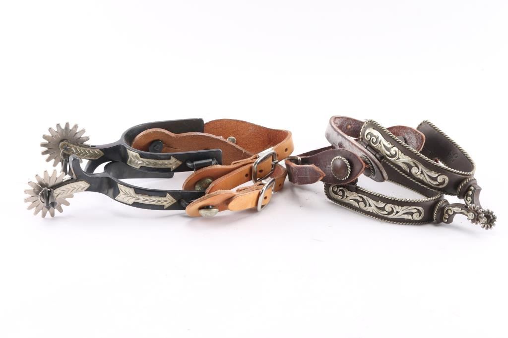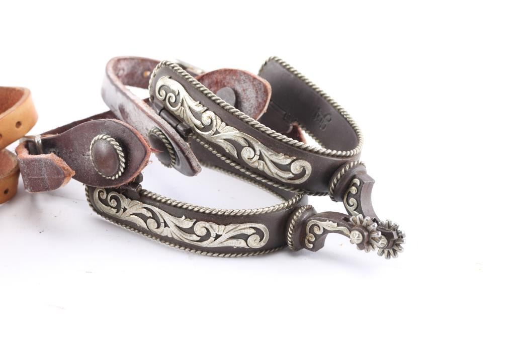 One pair maker marked Gist Classic Equine and has silver colored metal overlay design on dark brown leather. The other have silver colored metal over an arrow design on metal.