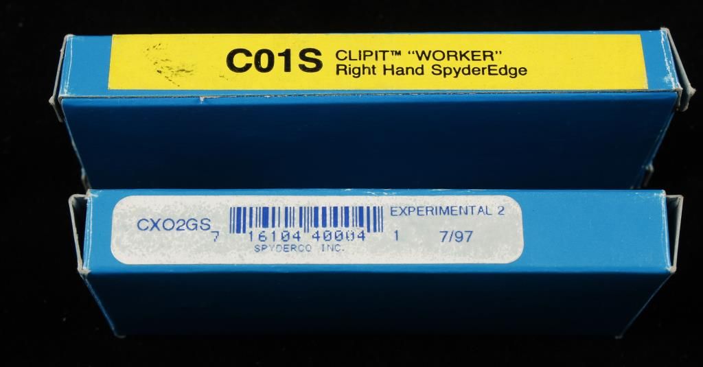 One is a Clipit "Worker" (C01S) with stainless scales and a pocket clip. The other is a Experimental 2 (CXO2GS) with a pocket clip. Both are in boxes with maintenance instructions.