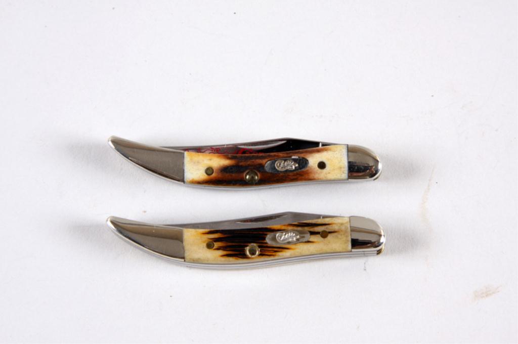 Lot of 2 Stag Handled 2 Blade Case Knives One has the red scroll on the blade which by Case standards means it is in near fine condition when it left the factory, both are in like new condition.One has the red scroll on the blade which by Case standards means it is in near fine condition when it left the factory, both are in like new condition.