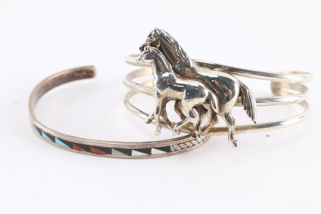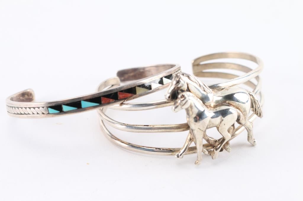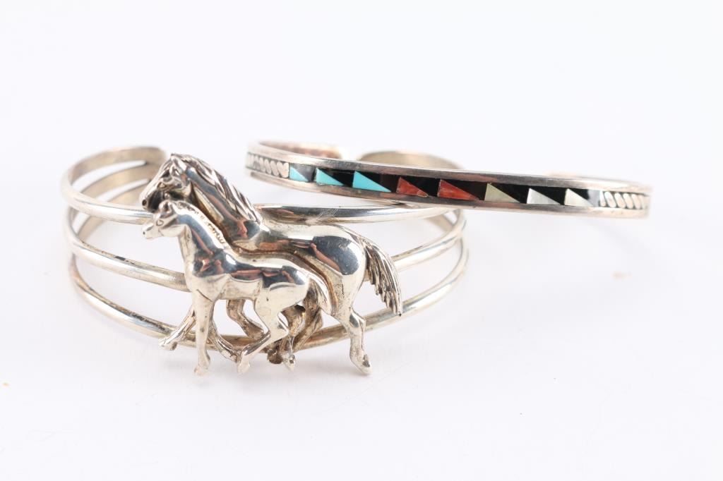 (1) A sterling silver horse and colt set onto 3 band sterling cuff, measures 7" including gap. (1) Onyx, turquoise, coral, mother of pearl inlaid in thin sterling silver cuff. Measures 7" including gap.
