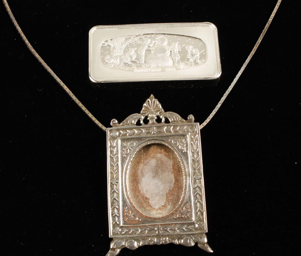 Includes 1 small bar (1000 grains) sterling silver from Franklin Mint, and 1 frame necklace.