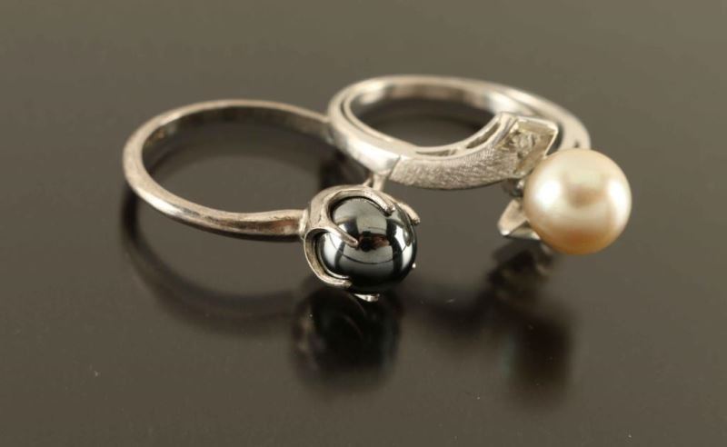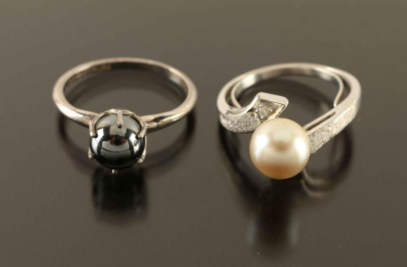 Both have marked sterling silver bands, one a Tahitian pearl size 7 1/2 and the other a large cultured pearl with nice creamy luster size 6.