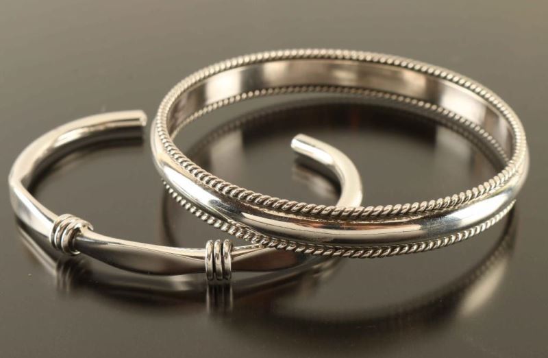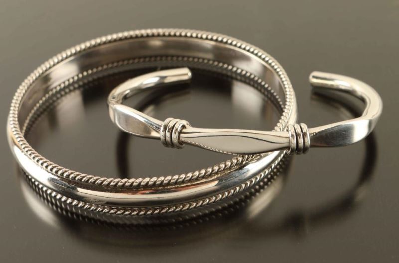 (1) Navajo sterling silver bangle hoop bracelet. Signed 'Sterling' and 'Tahe'. Inside circumference 2 1/2". (1) Sterling silver wire wrap cuff bracelet, measures 2 1/4" inside, hallmarked.