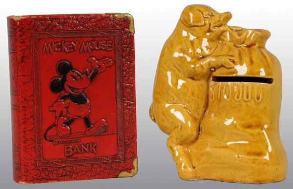 Description Includes one Mickey Mouse book bank and one pig with money bag porcelain bank. Condition (Excellent).