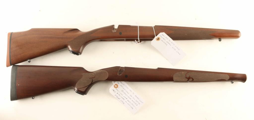Includes (1) Newer Style Model 70 Feather Weight for .270 shortmag; has partial bedded-rear action & recoil lug with good recoil with minor marks on the right side; checkering is very well done, and (1) New Model 70 Winchester Stock for a standard barrel and open magazine; checkering is well done.