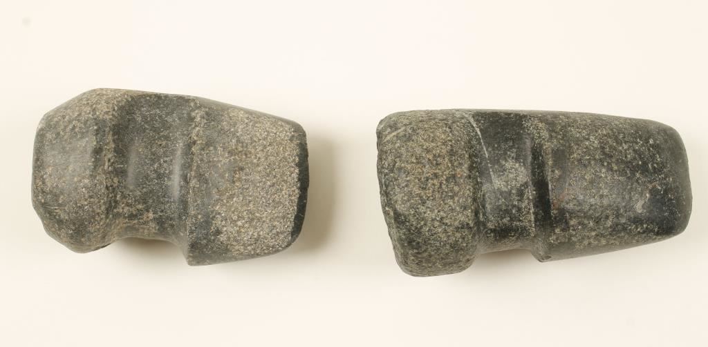 1 green stone that measures 5" x 2 1/2" and 1 gray stone that measures 5" x 3". Unknown age or origin.