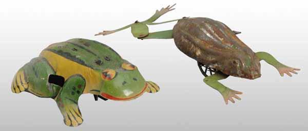 Description German. Working. The smaller toy is lithographed and marked "Gama" with very little wear while the larger toy is hand-painted with a lot of paint loss to top of frog. Condition (Very Good). Size Largest: 6" L.