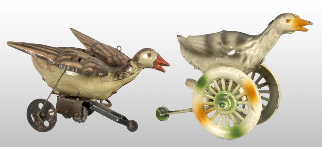 Description German. One is lithographed tin with articulated wings that flap up and down and other is hand-painted with push-lever action probably made by Doll Company. Lithographed toy has a small hole in tin due to oxidation and both have moderate wear. Condition (Excellent). Size Both: 6" L.