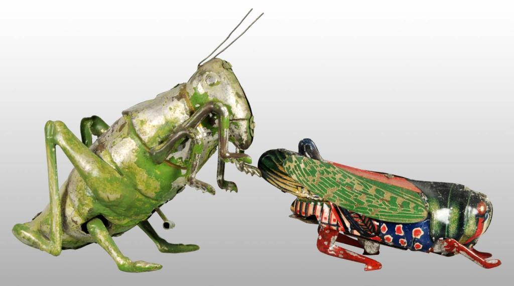 Description German. Working. Includes one lithographed cricket with minor overall paint loss and wear and one hand-painted grasshopper retaining 50% of its paint. When wound, both hop. Condition (Very Good). Size Largest: 7" L.