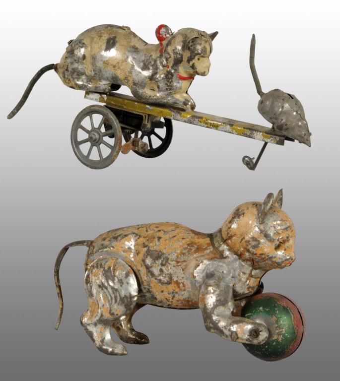Description German. Working. Includes one, very unusual, wind-up platform toy with a cat and mouse. When wound, toy rolls forward while mouse sways back and forth. Also includes one push toy with a hand-painted cat and nicely lithographed ball which rolls when pushed forward. Both have moderate overall paint loss and wear. Condition (Good - Very Good). Size Both: 8" L.