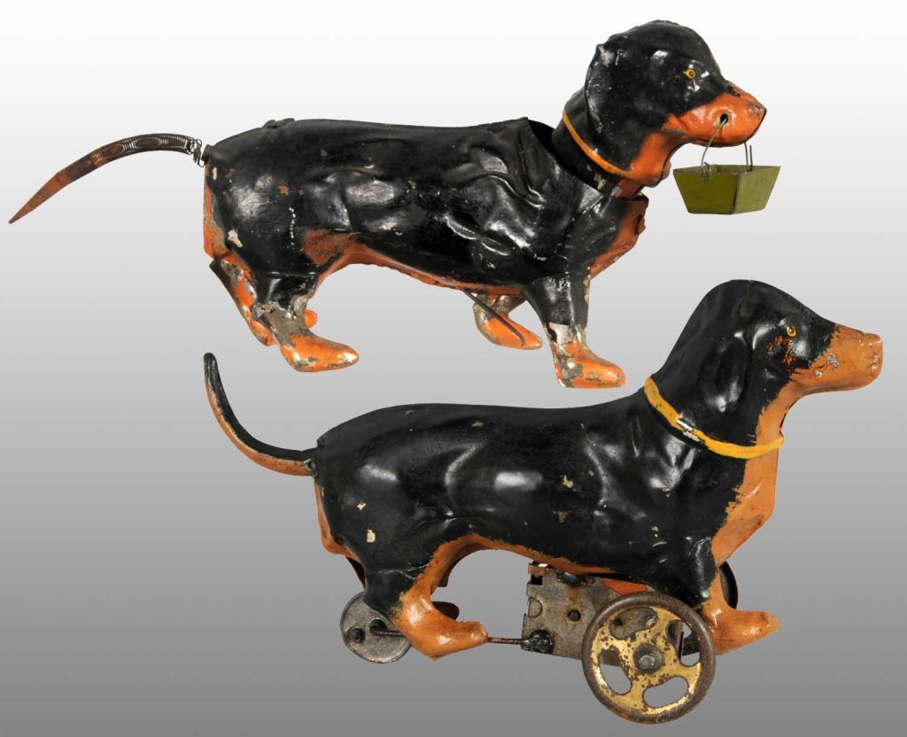 Description German. Working. Includes one with a spring tail and one with a metal tail. When wound, one rolls forward on three wheels, while the other, when wound, carries a tin box while his head moves up and down. Both have very minor paint loss. Condition (Excellent). Size 6" L.