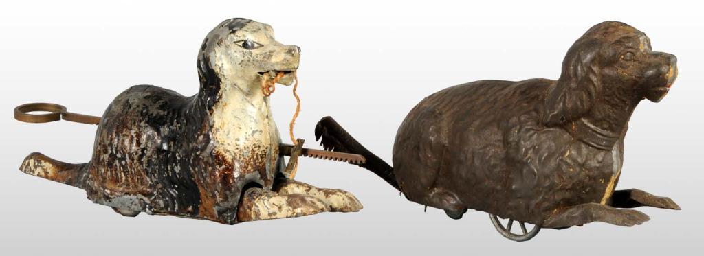 Description German. Working. Includes one wind-up and one wound with flywheel rod with a metal bone attached to mouth. One small solder repair to wind-up toy to hold mechanism to body with very little paint remaining. Flywheel toy has moderate overall paint loss and wear. Condition (Good - Very Good). Size Both: 8" L.
