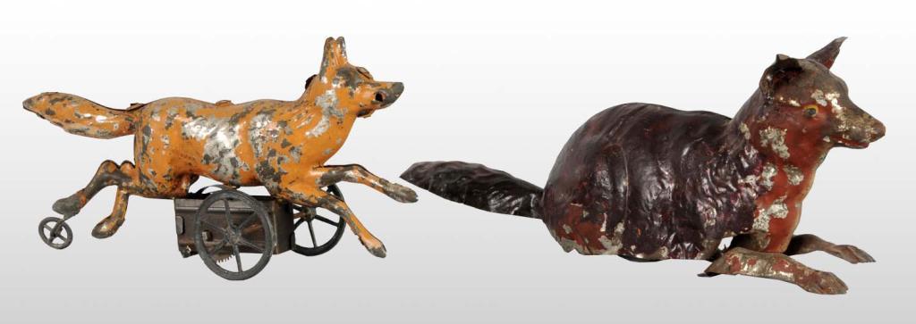 Description German. Working. Both have wheels on bottom. When wound, toys roll forward. Moderate paint loss and wear. Condition (Very Good). Size Largest: 7" L.