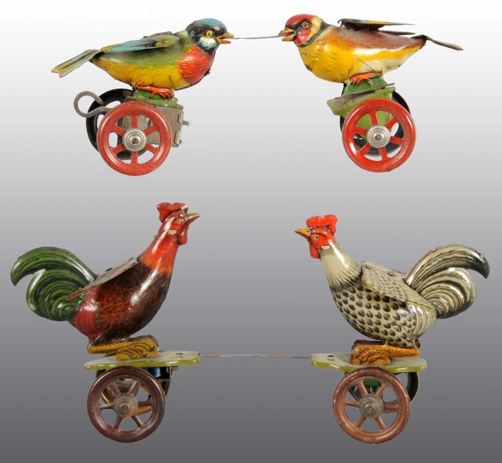Description German. Working. Beautiful early lithography of two roosters on platform and two birds fighting over a metal piece representing a worm. Wings are all separate pieces as are tails on birds. Minor wear to wheels on rooster toy. Condition (Excellent - Near Mint). Size 8" L.